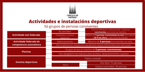 - Grupos de máximo 5 persoas. Limítanse os grupos para o desenvolvemento de calquera actividade ou evento familiar ou social en espazos públicos ou privados aos constituídos exclusivamente por persoas conviventes.